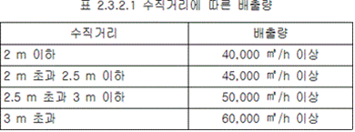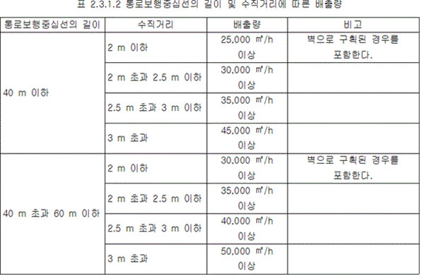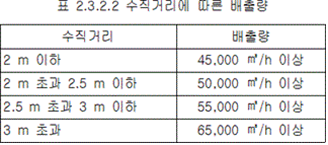 2.3.2.2 예상제연구역이 직경 40 m인 원의 범위를 초과할 경우 배출량은 45,000 ㎥/h 이상으로 할 것. 다만, 예상제연구역이 제연경계로 구획된 경우에는 그 수직거리에 따라 배출량은 다음 표 2.3.2.2에 따른다.