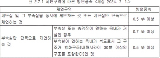 2. 기술기준 2.1 제연방식 2.1.1 이 기준에 따른 제연설비는 다음의 기준에 적합해야 한다. 2.1.1.1 제연구역에 옥외의 신선한 공기를 공급하여 제연구역의 기압을 제연구역 이외의 옥내(이하 "옥내"라 한다)보다 높게 하되 일정한 기압의 차이(이하 "차압"이라 한다)를 유지하게 함으로써 옥내로부터 제연구역 내로 연기가 침투하지 못하도록 할 것 2.1.1.2 피난을 위하여 제연구역의 출입문이 일시적으로 개방되는 경우 방연풍속을 유지하도록 옥외의 공기를 제연구역 내로 보충 공급하도록 할 것 2.1.1.3 출입문이 닫히는 경우 제연구역의 과압을 방지할 수 있는 유효한 조치를 하여 차압을 유지할 것 2.2 제연구역의 선정 2.2.1 제연구역은 다음의 어느 하나에 따라야 한다. 2.2.1.1 계단실 및 그 부속실을 동시에 제연하는 것 2.2.1.2 부속실을 단독으로 제연하는 것 2.2.1.3 계단실을 단독으로 제연하는 것 2.2.1.4 <삭제 2024. 7. 1.> 2.3 차압 등 2.3.1 2.1.1.1의 기준에 따라 제연구역과 옥내와의 사이에 유지해야 하는 최소차압은 40 ㎩(옥내에 스프링클러설비가 설치된 경우에는 12.5 ㎩) 이상으로 해야 한다. 2.3.2 제연설비가 가동되었을 경우 출입문의 개방에 필요한 힘은 110 N 이하로 해야 한다. 2.3.3 2.1.1.2의 기준에 따라 출입문이 일시적으로 개방되는 경우 개방되지 않은 제연구역과 옥내와의 차압은 2.3.1의 기준에도 불구하고 2.3.1의 기준에 따른 차압의 70 % 이상이어야 한다. 2.3.4 계단실과 부속실을 동시에 제연하는 경우 부속실의 기압은 계단실과 같게 하거나 계단실의 기압보다 낮게 할 경우에는 부속실과 계단실의 압력 차이는 5 ㎩ 이하가 되도록 해야 한다. 2.4 급기량 2.4.1 급기량은 다음의 양을 합한 양 이상이 되어야 한다. 2.4.1.1 2.1.1.1의 기준에 따른 차압을 유지하기 위하여 제연구역에 공급해야 할 공기량. 이 경우 제연구역에 설치된 출입문(창문을 포함한다. 이하 "출입문등"이라 한다)의 누설량과 같아야 한다. 2.4.1.2 2.1.1.2의 기준에 따른 보충량 2.5 누설량 2.5.1 2.4.1.1의 기준에 따른 누설량은 제연구역의 누설량을 합한 양으로 한다. 이 경우 출입문이 2개소 이상인 경우에는 각 출입문의 누설틈새면적을 합한 것으로 한다. 2.6 보충량 2.6.1 2.4.1.2의 기준에 따른 보충량은 부속실의 수가 20개 이하는 1개 층 이상, 20개를 초과하는 경우에는 2개 층 이상의 보충량으로 한다. <개정 2024. 7. 1.> 2.7 방연풍속 2.7.1 방연풍속은 제연구역의 선정방식에 따라 다음 표 2.7.1의 기준에 적합해야 한다.