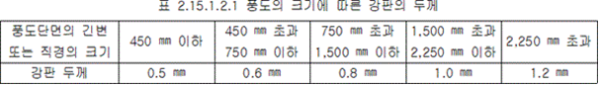 2.8 과압방지조치 2.8.1 제연구역에서 발생하는 과압을 해소하기 위해 과압방지장치를 설치하는 등의 과압방지초치를 해야 한다. 다만, 제연구역 내에 과압발생의 우려가 없다는 것을 시험 또는 공학적인 자료로 입증하는 경우에는 과압방지조치를 하지 않을 수 있다. <개정 2024. 4. 1.> 2.8.1.1 <삭제 2024. 4. 1.> 2.8.1.2 <삭제 2024. 4. 1.> 2.8.1.3 <삭제 2024. 4. 1.> 2.8.1.4 <삭제 2024. 4. 1.> 2.8.1.5 <삭제 2024. 4. 1.> 2.9 누설틈새의 면적 등 2.9.1 제연구역으로부터 공기가 누설하는 틈새면적은 다음의 기준에 따라야 한다. 2.9.1.1 출입문의 틈새면적은 다음의 식 (2.9.1.1)에 따라 산출하는 수치를 기준으로 할 것. 다만, 방화문의 경우에는 「한국산업표준」에서 정하는 「문세트(KS F 3109)」에 따른 기준을 고려하여 산출할 수 있다. A = (L / ℓ) × Ad … (2.9.1.1) 여기에서 A: 출입문의 틈새(㎡) L: 출입문 틈새의 길이(m). 다만, L의 수치가 ℓ의 수치 이하인 경우에는 ℓ의 수치로 할 것 ℓ: 외여닫이문이 설치되어 있는 경우에는 5.6, 쌍여닫이문이 설치되어 있는 경우에는 9.2, 승강기의 출입문이 설치되어 있는 경우에는 8.0으로 할 것 Ad: 외여닫이문으로 제연구역의 실내 쪽으로 열리도록 설치하는 경우에는 0.01, 제연구역의 실외 쪽으로 열리도록 설치하는 경우에는 0.02, 쌍여닫이문의 경우에는 0.03, 승강기의 출입문에 대하여는 0.06으로 할 것 2.9.1.2 창문의 틈새면적은 다음의 식 (2.9.1.2.1), (2.9.1.2.2), (2.9.1.2.3)에 따라 산출하는 수치를 기준으로 할 것. 다만,「한국산업표준」에서 정하는 「창세트(KS F 3117)」에 따른 기준을 고려하여 산출할 수 있다. 2.9.1.2.1 여닫이식 창문으로서 창틀에 방수팩킹이 없는 경우 2.9.1.2.2 여닫이식 창문으로서 창틀에 방수팩킹이 있는 경우 2.9.1.2.3 미닫이식 창문이 설치되어 있는 경우 2.9.1.3 제연구역으로부터 누설하는 공기가 승강기의 승강로를 경유하여 승강로의 외부로 유출하는 유출면적은 승강로와 승강로 상부의 기계실 사이의 개구부 면적을 합한 것을 기준으로 할 것 2.9.1.4 제연구역을 구성하는 벽체(반자속의 벽체를 포함한다)가 벽돌 또는 시멘트블록 등의 조적구조이거나 석고판 등의 조립구조인 경우에는 불연재료를 사용하여 틈새를 조정할 것 <개정 2024. 7. 1.> 2.9.1.5 제연설비의 완공 시 제연구역의 출입문등은 크기 및 개방방식이 해당 설비의 설계 시와 같도록 할 것 2.10 유입공기의 배출 2.10.1 유입공기는 화재 층의 제연구역과 면하는 옥내로부터 옥외로 배출되도록 해야 한다. 다만, 직통계단식 공동주택의 경우에는 그렇지 않다. 2.10.2 유입공기의 배출은 다음의 기준에 따른 배출방식으로 해야 한다. 2.10.2.1 수직풍도에 따른 배출: 옥상으로 직통하는 전용의 배출용 수직풍도를 설치하여 배출하는 것으로서 다음의 어느 하나에 해당하는 것 2.10.2.1.1 자연배출식: 굴뚝효과에 따라 배출하는 것 2.10.2.1.2 기계배출식: 수직풍도의 상부에 전용의 배출용 송풍기를 설치하여 강제로 배출하는 것. 다만, 지하층만을 제연하는 경우 배출용 송풍기의 설치위치는 배출된 공기로 인하여 피난 및 소화활동에 지장을 주지 않는 곳에 설치할 수 있다. 2.10.2.2 배출구에 따른 배출: 건물의 옥내와 면하는 외벽마다 옥외와 통하는 배출구를 설치하여 배출하는 것 2.10.2.3 제연설비에 따른 배출: 거실제연설비가 설치되어 있고 당해 옥내로부터 옥외로 배출해야 하는 유입공기의 양을 거실제연설비의 배출량에 합하여 배출하는 경우 유입 공기의 배출은 당해 거실제연설비에 따른 배출로 갈음할 수 있다. 2.11 수직풍도에 따른 배출 2.11.1 수직풍도에 따른 배출은 다음의 기준에 적합해야 한다. 2.11.1.1 수직풍도는 내화구조로 하되 「건축물의 피난ㆍ방화 구조 등의 기준에 관한 규칙」 제3조제1호 또는 제2호의 기준 이상의 성능으로 할 것 2.11.1.2 수직풍도의 내부면은 두께 0.5 ㎜ 이상의 아연도금강판 또는 동등 이상의 내식성ㆍ내열성이 있는 것으로 마감하되, 접합부에 대하여는 통기성이 없도록 조치할 것 2.11.1.3 각층의 옥내와 면하는 수직풍도의 관통부에는 다음의 기준에 적합한 댐퍼(이하 "배출댐퍼"라 한다)를 설치해야 한다. 2.11.1.3.1 배출댐퍼는 두께 1.5 ㎜ 이상의 강판 또는 이와 동등 이상의 성능이 있는 것으로 설치해야 하며 비 내식성 재료의 경우에는 부식방지 조치를 할 것 2.11.1.3.2 평상시 닫힌 구조로 기밀상태를 유지할 것 2.11.1.3.3 개폐여부를 당해 장치 및 제어반에서 확인할 수 있는 감지 기능을 내장하고 있을 것 2.11.1.3.4 구동부의 작동상태와 닫혀 있을 때의 기밀상태를 수시로 점검할 수 있는 구조일 것 2.11.1.3.5 풍도의 내부마감 상태에 대한 점검 및 댐퍼의 정비가 가능한 이ㆍ탈착식 구조로 할 것 2.11.1.3.6 화재 층에 설치된 화재감지기의 동작에 따라 당해 층의 댐퍼가 개방될 것 <개정 2024. 4. 1.> 2.11.1.3.7 개방 시의 실제 개구부(개구율을 감안한 것을 말한다)의 크기는 2.11.1.4의 기준에 따른 수직풍도의 최소 내부단면적 이상으로 할 것 <개정 2024. 4. 1.> 2.11.1.3.8 댐퍼는 풍도 내의 공기흐름에 지장을 주지 않도록 수직풍도의 내부로 돌출하지 않게 설치할 것 2.11.1.4 수직풍도의 내부단면적은 다음의 기준에 적합할 것 2.11.1.4.1