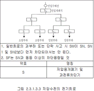 2. 기술기준 2.1 인입선 및 인입구 배선의 시설 2.1.1 인입선은 특정소방대상물에 화재가 발생할 경우에도 화재로 인한 손상을 받지 않도록 설치해야 한다. 2.1.2 인입구 배선은 「옥내소화전설비의 화재안전기술기준(NFTC 102)」 2.7.2의 표 2.7.2(1)에 따른 내화배선으로 해야 한다. 2.2 특별고압 또는 고압으로 수전하는 경우 2.2.1 일반전기사업자로부터 특별고압 또는 고압으로 수전하는 비상전원 수전설비는 방화구획형, 옥외개방형 또는 큐비클(Cubicle)형으로서 다음의 기준에 적합하게 설치해야 한다. 2.2.1.1 전용의 방화구획 내에 설치할 것 2.2.1.2 소방회로배선은 일반회로배선과 불연성의 격벽으로 구획할 것. 다만, 소방회로배선과 일반회로배선을 15 ㎝ 이상 떨어져 설치한 경우는 그렇지 않다. 2.2.1.3 일반회로에서 과부하, 지락사고 또는 단락사고가 발생한 경우에도 이에 영향을 받지 아니하고 계속하여 소방회로에 전원을 공급시켜 줄 수 있어야 할 것 2.2.1.4 소방회로용 개폐기 및 과전류차단기에는 "소방시설용"이라 표시할 것 2.2.1.5 전기회로는 그림 2.2.1.5와 같이 결선할 것