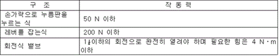 에어로졸식 소화용구의 형식승인 및 제품검사의 기술기준 [시행 2024. 11. 1.] [소방청고시 제2024-49호, 2024. 11. 1., 일부개정.] 소방청(소방산업과), 044-205-7511 제1조(목 적) 이 기준은 「소방시설 설치 및 관리에 관한 법률」 제37조제5항에서 소방청장에게 위임한 에어로졸식 소화용구의 형식승인 및 제품검사의 기술기준에 관한 사항을 규정함을 목적으로 한다.<개정 2016. 7. 15., 2024. 11. 1.> 제2조(용어의 정의) 이 기준에서 사용하는 용어의 정의는 다음과 같다. 1. <삭제><개정 2012. 2. 9., 2019. 9. 24., 2024. 11. 1.> 2. "에어로졸식 소화용구"(이하 "소화용구"라 한다)란 사람이 조작하여 소화약제를 압력에 의하여 방사하는 기구로서 「소화기의 형식승인 및 제품검사의 기술기준」 제4조제1항에서 규정하는 능력단위가 1 미만이고 한번 사용한 후에는 다시 사용할 수 없는 형의 것을 말한다.<개정 2017. 3. 3., 2019. 9. 24., 2024. 11. 1.> 제3조(일반구조) 소화용구의 구조는 다음 각 호에 적합하여야 한다. 1. 고정된 상태에서 사용하는 것 또는 기계적으로 조작하여 사용하는 것이 아니어야 한다. 2. <삭제> 3. 부식에 의하여 기능에 이상을 미칠 염려가 있는 부분은 내식가공을 하여야 한다. 4. 내부에 충전하는 가압용가스는 불연성으로서 소화약제의 성능, 성질 또는 상태에 나쁜 영향을 주지 아니하여야 한다. 5. 소화약제를 재충전하지 아니하는 일회용의 구조이어야 한다. 6. 돌출된 밸브에는 보호장치가 있어야 한다. 7. 사용온도범위(0 ℃ 이상 40 ℃ 이하를 말한다. 이하 같다)안에서 기능에 이상이 발생되지 아니하여야 한다. 다만, 사용온도범위를 확대하고자 하는 경우에는 10 ℃ 단위로 하여야 한다. 8. 소화용구의 작동력(방사하는데 필요한 힘)은 다음 조건에 적합하여야 한다.
