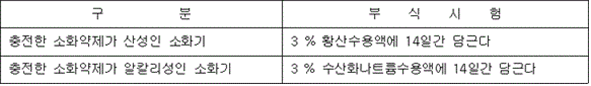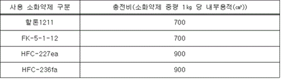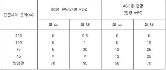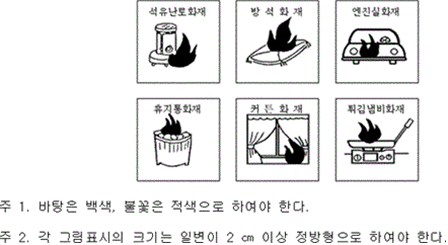 5. 겉보기비중은 0.8 그램/밀리리터 이상이어야 하고, 설계값 ±0.1 그램/밀리리터 이내이어야 한다. 6. 분말을 수면에 고르게 살포한 경우에 1시간 이내에 침강하지 아니하여야 한다. 7. 칼륨의 중탄산염이 주성분인 소화약제는 담회색으로, 인산염 등이 주성분인 소화약제는 담홍색 또는 황색으로 착색하여야 하며 이를 혼합하지 아니하여야 한다. 8. 분말상태의 소화약제는 굳거나 덩어리지거나 변질 등 그 밖의 이상이 생기지 아니하여야 하며 침입도시험기(Penetrometer)로 시험한 경우 15 밀리미터 이상 침투되어야 한다. 9. 온도상승시험 (60 ± 2) ℃에서 7일간 보존하고 상온에서 3일간 보존한 후 유동성이 있어야 하며 고화되지 아니하여야 한다. 10. 절연내력시험 C급화재용은 최소 5 000볼트의 교류전압을 가하는 시험에서 내전압에 이상이 없어야 한다. ② 소화용구에 충전하는 강화액소화약제는 다음 각 호에 적합한 수용액이어야 한다.<개정 2019. 9. 24., 2024. 11. 1.> 1. 알칼리금속염류의 수용액인 경우에는 알칼리성 반응을 나타내어야 한다. 2. 강화액소화약제의 응고점은 -20 ℃ 이하이어야 한다. 3. 강화액소화약제와 접촉하는 금속재료를 (50 ± 2) ℃에서 90일간 소화약제에 침지한 후 금속재료의 중량손실은 각각 1일에 1 밀리그램/58.9제곱센티미터 이하이어야 한다. 4. 강화액소화약제의 침전량은 (20 ± 2) ℃의 강화액소화약제를 원심분리용 시험관에 넣고 상대원심력을 분당 회전수 (600 ∼ 700)으로 원심 분리하여 생기는 침전물이 0.1 Vol%(부피 퍼센트) 이하이어야 한다. 5. 강화액소화약제의 변질시험 (65 ± 2) ℃로 216시간 보존한 후 상온으로 환원하고, 다시 - (18 ± 2) ℃로 24시간 보존한 후 상온으로 환원시키는 시험) 후의 침전량은 제4호의 규정에 의한 방법으로 측정한 경우 0.2 vol%(부피 퍼센트) 이하이어야 한다. 6. 강화액소화약제의 표면장력은 33 밀리뉴턴/미터 이하이어야 하며, 설계값의 -3.0 밀리뉴턴/미터 ~ 1.5 밀리뉴턴/미터이어야 한다. 7. 비중은 KS M 0004(화학 제품의 밀도 및 비중 측정 방법)의 비중부액계 또는 비중병 등을 사용하여 (20 ± 0.5) ℃에서 측정하였을 때 설계값의 ±0.02 이내이어야 한다. 8. 수소이온농도는 KS M 0011(수용액의 pH측정방법)에 따라 (20 ± 2) ℃에서 측정한 경우 pH (6 ~ 9) 범위이어야 하며, 설계값의 ±0.4 이내이어야 한다. ③ 소화용구에 충전하는 침윤수용액(물의 침투능력, 분산능력 및 유화능력 등을 증대하기 위하여 침윤제와 혼합한 약제를 말한다)소화약제는 다음 각 호에 적합하여야 한다.<신설 2024. 11. 1.> 1. 침윤수용액의 표면장력은 33 밀리뉴턴/미터 이하이어야 한다. 2. 용액의 분리시험 가. 침윤수용액은 0 ℃에서 50 ℃의 온도범위에서 분리되어서는 아니 된다. 나. 가목에서 규정한 시험을 하는 경우 침전현상(시험기간 중에 발생한 것도 포함한다), 흐려지는 현상 등 이와 유사한 현상 등은 분리현상으로 본다. 3. 금속부식시험 침윤수용액과 접촉하는 금속재료를 (50 ± 2) ℃에서 90일간 소화약제에 침지한 후 금속재료의 중량손실은 각각 1일에 1 밀리그램/58.9제곱센티미터 이하이어야 한다. 4. 침윤수용액은 부패하거나 변질 등이 발생하여서는 아니 된다. 5. 수소이온농도는 KS M 0011(수용액의 pH측정방법)에 따라 (20 ± 2) ℃에서 측정한 경우 pH (6 ~ 9) 범위이어야 하며, 설계값의 ±0.4 이내이어야 한다. ④ 소화용구에 충전하는 할로겐화합물 등 가스계소화약제는 다음 각 호의 어느 하나에 적합하여야 한다.<신설 2024. 11. 1.> 1. 브로모클로로디플루오로메탄(이하 "할론 1211"이라 한다), 도데카플루오로-2-메틸 펜탄-3-원(이하 "FK-5-1-12"라 한다), 헥사플루오로프로판(이하 "HFC-236fa"라 한다), 헵타플루오르프로판(이하 "HFC-227ea"라 한다) 등의 소화약제 순도는 99.0 mol%(몰분율) 이상이어야 한다. 2. 하론1211과 할론1301을 혼합하는 경우는 불순물이 1.5 mol%(몰분율) 이하이어야 한다. ⑤ 수용액 등 액체상태의 소화약제는 결정이 석출되지 아니하고 용액이 분리되거나 부유물 또는 침전물이 발생하는 등의 이상이 생기지 아니하여야 하며, 과불화옥탄술폰산(그 염류와 과불화옥탄술포닐플로라이드를 포함한다) 및 과불화옥탄산(그 염류를 포함한다)을 함유하지 않아야 한다.<신설 2024. 11. 1.> ⑥ 소화약제의 중량은 신청값의 ±5 퍼센트 범위 이내이어야 한다.<개정 2019. 9. 24., 2024. 11. 1.> 제15조(표시) ① 소화용구에는 다음 사항을 보기 쉬운 부위에 잘 지워지지 아니하도록 표시하여야 한다.<개정 2012. 2. 9., 2024. 11. 1.> 1. 종별 및 형식 2. 형식승인번호 3. 제조연월 및 제조번호 4. 제조업체명 또는 상호(수입품인 경우 수입원) 5. 사용온도범위 6. 적응화재(다음의 그림 중 그 소화용구가 사용되는 그림의 표시를 하여야 하며, 그림표시의 바로 근처에는 "그림으로 표시하는 화재의 초기진화에 유효합니다."라는 표기를 하여야 한다.)