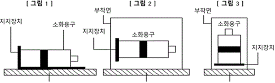 ③ 외부와 접촉하는 부분은 20 wt%(질량 퍼센트)의 염수분무에 240시간 노출하였을 때 다음 각 호에 적합하여야 한다.<신설 2024. 11. 1.> 1. 부식이 발생하지 아니하여야 하며 작동에 이상이 없어야 한다.<신설 2024. 11. 1.> 2. 부식방지를 위한 칠을 손가락으로 문지를 때에 밀리거나 떨어지지 않아야 한다.<신설 2024. 11. 1.> 제8조(방사시험) 소화용구는 사용온도범위 안에서 정상적인 조작방법으로 방사할 때 다음 각 호에 적합하여야 한다. 1. 방사조작을 완료한 때로부터 2초 이내에 소화약제를 유효하게 방사할 수 있어야 한다. 2. 방사시간은 (20 ± 2) ℃에서 6초 이상이어야 하며, (사용하한온도 ± 2) ℃, (20 ± 2) ℃, (사용상한온도 ± 2) ℃에서 각각 설계값의 ± 30 퍼센트 이내이어야 한다.<개정 2012. 2. 9., 2019. 9. 24., 2024. 11. 1.> 3. 방사효율은 85 퍼센트 이상이어야 한다.<개정 2012. 2. 9., 2019. 9. 24., 2024. 11. 1.> 제8조의2(간헐방사시험) 축압식 소화용구는 (사용하한온도 ± 2) ℃, (20 ± 2) ℃, (사용상한온도 ± 2) ℃에서 각각 16시간 이상 보존 후 2초 개방 후 2초 폐쇄를 주기로 하여 반복 작동하는 경우 충전된 소화약제 중량의 80 퍼센트 이상 방사되어야 한다.<신설 2024. 11. 1.> 제9조(기밀시험) 축압식 소화용구는 (48 ± 2) ℃의 온수 중에 1시간 담그는 시험에서 충전가스가 새지 않아야 한다.<개정 2012. 2. 9., 2024. 11. 1.> 제10조(온도반복시험) 소화용구는 (사용상한온도 ± 2) ℃에서 24시간 놓아두고 다시 (사용하한온도 ± 2) ℃에서 24시간 놓아둔 상태를 1사이클로 하여 5사이클 반복한 후 제8조 및 제9조(가압식 소화용구는 제외한다)의 시험에 적합하여야 한다.<개정 2024. 11. 1.> 제10조의2(고온노출시험) 자동차 엔진실 화재에 사용하는 소화용구는 (80 ± 2) ℃에서 7일간 보존한 후 다음 각 호에 적합하여야 한다.<개정 2012. 2. 9., 2024. 11. 1.> 1. 부품의 이탈, 파손, 변형 등 제품에 손상이 없을 것 2. (20 ± 2) ℃ 온도에서 1시간 기밀시험 시 압력 누설이 없을 것 제11조(내압시험) ① 축압식 소화용구의 용기 및 밸브 등은 다음 각 호의 내압시험에 적합하여야 한다.<개정 2019. 9. 24., 2024. 11. 1.> 1. 내부압력(Q)의 1.5배와 1.3 메가파스칼 중 높은 압력을 5분간 수압력으로 가하는 경우 물이 새거나 현저한 변형이 생기지 않아야 한다. 이 경우, 내부압력(Q)은 소화용구의 내부온도를 (50 ± 2) ℃로 할 때 용기 내부압력의 최대값을 말한다. 2. 내부압력(Q)의 1.8배와 1.5 메가파스칼 중 높은 압력을 5분간 수압력으로 가하는 경우 파열되지 않아야 한다. ② 가압식 소화용구의 용기 및 밸브 등은 다음 각 호의 내압시험에 적합하여야 한다.<개정 2012. 2. 9., 2024. 11. 1.> 1. <삭제><개정 2024. 11. 1.> 2. <삭제><개정 2024. 11. 1.> 3. <삭제><개정 2024. 11. 1.> 4. 폐쇄압력(P)의 2배의 압력을 5분간 수압력으로 가하는 경우 물이 새거나 현저한 변형이 생기지 않아야 한다. 이 경우 폐쇄압력(P)은 소화용구의 내부온도를 (50 ± 2) ℃로 할 때 용기에 작용하는 폐쇄원 압력의 최대값을 말한다.<신설 2024. 11. 1.> 5. 폐쇄압력(P)의 2.7배의 압력을 5분간 수압력으로 가하는 경우 파열되지 않아야 한다.<신설 2024. 11. 1.> 제11조의2(가압용가스용기) 소화용구에 사용하는 가압용가스용기는 「소화기가압용가스용기의 성능인증 및 제품검사의 기술기준」에 적합한 것으로서 제품검사에 합격한 것이어야 한다.<개정 2012. 2. 9., 2024. 11. 1.> 제12조(진동시험) 자동차 엔진실 화재에 사용하는 소화용구는 다음 그림과 같이 진동판에 부착하여 각 호의 시험을 하는 경우 제품의 변형, 이탈, 파손이 없어야 하며 진동시험 후 제8조(방사시험)에 적합하여야 한다.