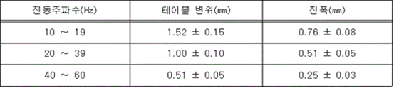 <개정 2012. 2. 9., 2019. 9. 24., 2024. 11. 1.> 1. 가변진동시험 아래 표에서 제시하는 테이블 변위에서 2 헤르츠의 진동주파수 간격으로 5분간 지속한다.