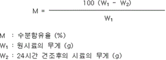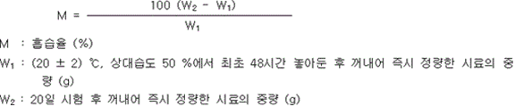 4. (20 ± 2) ℃, 50 퍼센트 상대습도에서 48시간 보존하고 다시 (20 ± 2) ℃, 80퍼센트 상대습도에서 48시간 동안 보존하는 시험을 반복하여 20일간 시험하는 경우 아래의 수식으로 계산한 흡습율이 중탄산나트륨이 주성분인 것은 0.2 wt%(질량 퍼센트), 중탄산칼륨이 주성분인 것은 2 wt%(질량 퍼센트), 인산염류 등이 주성분인 것은 1.5 wt%(질량 퍼센트) 이하이어야 하며, 시험 후 시료는 유동성이 있고 고화되지 아니하여야 한다.