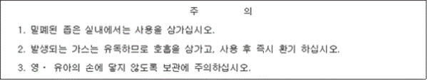 7. 충전된 소화약제의 주성분과 중량 또는 용량 8. 방사거리 및 방사시간 9. 총중량, 가압용가스용기의 가스종류 및 가스량(가압식에 한함) 10. 할로겐화합물 소화약제를 사용하는 소화용구에는 다음 사항을 표시하여야 한다. <개정 2019. 9. 24., 2024. 11. 1.> 11. 사용안내문(사용방법, 취급상의 주의사항) 12. <삭 제> 13. 품질보증에 관한 사항(보증기간, 보증내용, 자체검사필 등) 14. 소화용구에 충전한 소화약제의 물질안전자료(MSDS)에 언급된 동일한 소화약제명의 다음 각 목의 정보<신설 2024. 11. 1.> 가. 1 퍼센트를 초과하는 위험물질 목록 나. 5 퍼센트를 초과하는 화학물질 목록 다. MSDS에 따른 위험한 약제에 관한 정보 ② 제1항에서 규정한 사항을 표시하는 명판은 다음 각 호에서 정하는 시험을 하는 경우 적합하여야 한다. 다만, 용기에 직접 인쇄하는 하는 경우는 제외한다.<신설 2024. 11. 1.> 1. 명판노출시험 다음 각 목의 조건을 적용하여 시험하는 경우 명판의 오염, 흐려짐, 기포와 같은 현저한 변질이 없어야 하며 균열이나 말림이 없어야 한다. 가. (80 ± 2) ℃에서 240시간 동안 보존 나. (20 ± 2) ℃의 물에서 48시간 동안 침지 2. 명판부착시험 명판의 평균 부착력은 0.18 뉴턴/밀리미터 이상이어야 한다. 3. 명판마모시험 코팅되어 있지 아니한 명판은 물을 묻힌 천에 18 뉴턴의 하중을 걸어 500회 반복하는 시험을 적용하는 경우 손상되지 아니하고 읽을 수 있는 상태를 유지하여야 한다.<신설 2024. 11. 1.> 제16조(시험세칙) 「소방산업의 진흥에 관한 법률」 제14조에 따라 설립한 한국소방산업기술원은 이 기준의 운영방법, 형식시험방법 및 제품검사방법 등에 관한 세부사항인 시험세칙을 정하여 소방청장 승인을 받아 운영할 수 있다.<개정 2024. 11. 1.> 제17조(재검토기한) 소방청장은 「훈령ㆍ예규 등의 발령 및 관리에 관한 규정」에 따라 이 고시에 대하여 2024년 7월 1일 기준으로 매 3년이 되는 시점(매 3년째의 6월 30일까지를 말한다)마다 그 타당성을 검토하여 개선 등의 조치를 하여야 한다.<개정 2017. 3. 3., 2024. 11. 1.> 부칙 <제2024-49호, 2024. 11. 1.> 제1조(시행일) 이 고시는 발령한 날부터 시행한다. 제2조(형식승인에 관한 일반적인 경과조치) ① 이 고시 시행 전에 형식승인(형식승인 변경 신청을 포함한다. 이하 같다)을 신청하여 이 고시 시행 당시 그 형식승인 절차가 진행 중인 경우에는 개정규정에도 불구하고 종전의 규정에 따른다. ② 이 고시 시행 전에 종전의 규정에 따라 형식승인을 받은 경우 또는 제1항에 따라 형식승인을 받은 경우에는 이 고시에 따라 그 형식승인을 받은 것으로 본다. 다만, 이 고시 시행일로부터 1년 이내에 개정규정에 따라 다시 형식승인을 받아야 한다. 제3조(제품검사에 대한 경과조치) ① 이 고시 시행 전에 제품검사(품질제품검사의 경우에는 합격표시 교부를 말한다. 이하 같다.)를 신청한 경우로서 이 고시 시행 당시 그 검사가 진행 중인 경우에는 개정규정에도 불구하고 종전의 규정에 따른다. ② 부칙 제2조제1항 및 같은 조 제2항 본문에 따라 형식승인을 받은 소방용품에 대한 제품검사는 개정 규정에도 불구하고 이 고시 시행일로부터 1년 이내에는 종전의 규정에 따른다.
